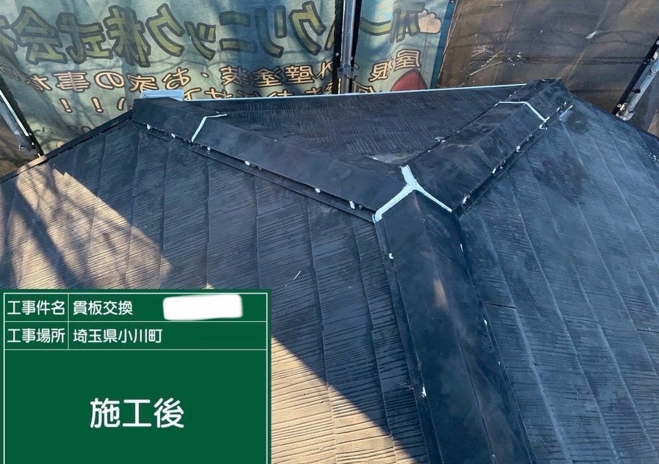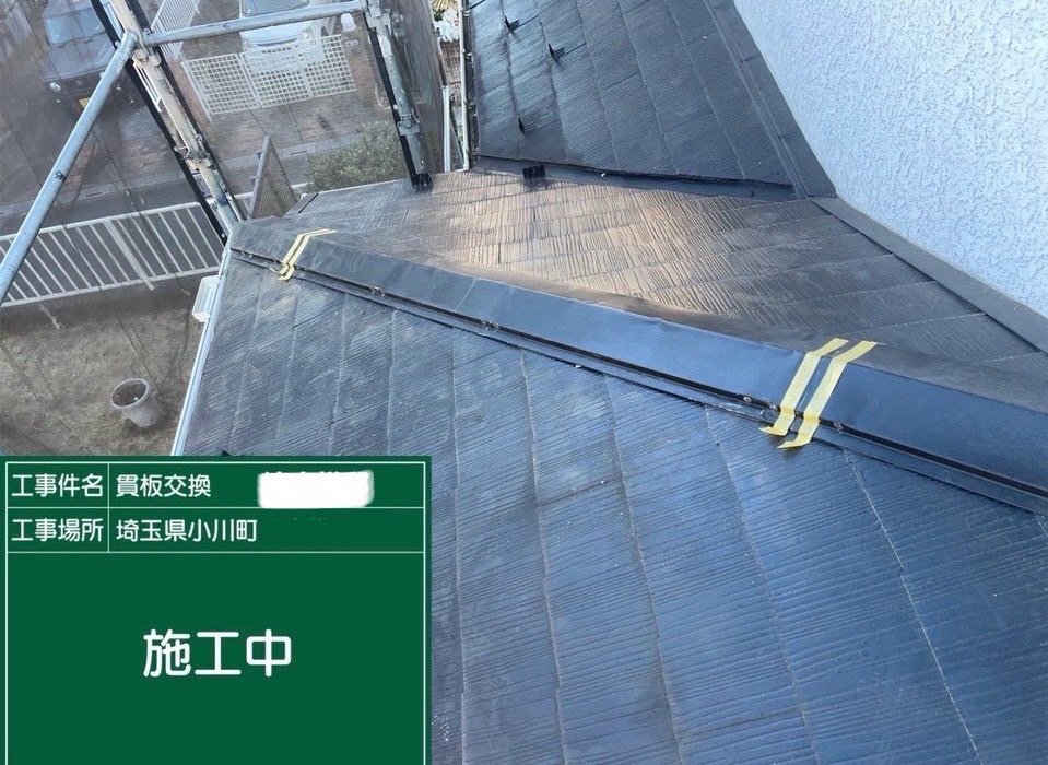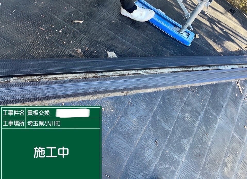 スレート屋根の棟板金の下の貫板が、劣化で腐ってきていたので、そこを撤去してから、新設で、樹脂製の貫板に交換しました。