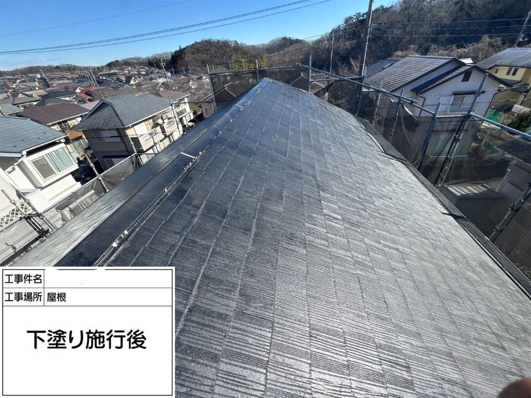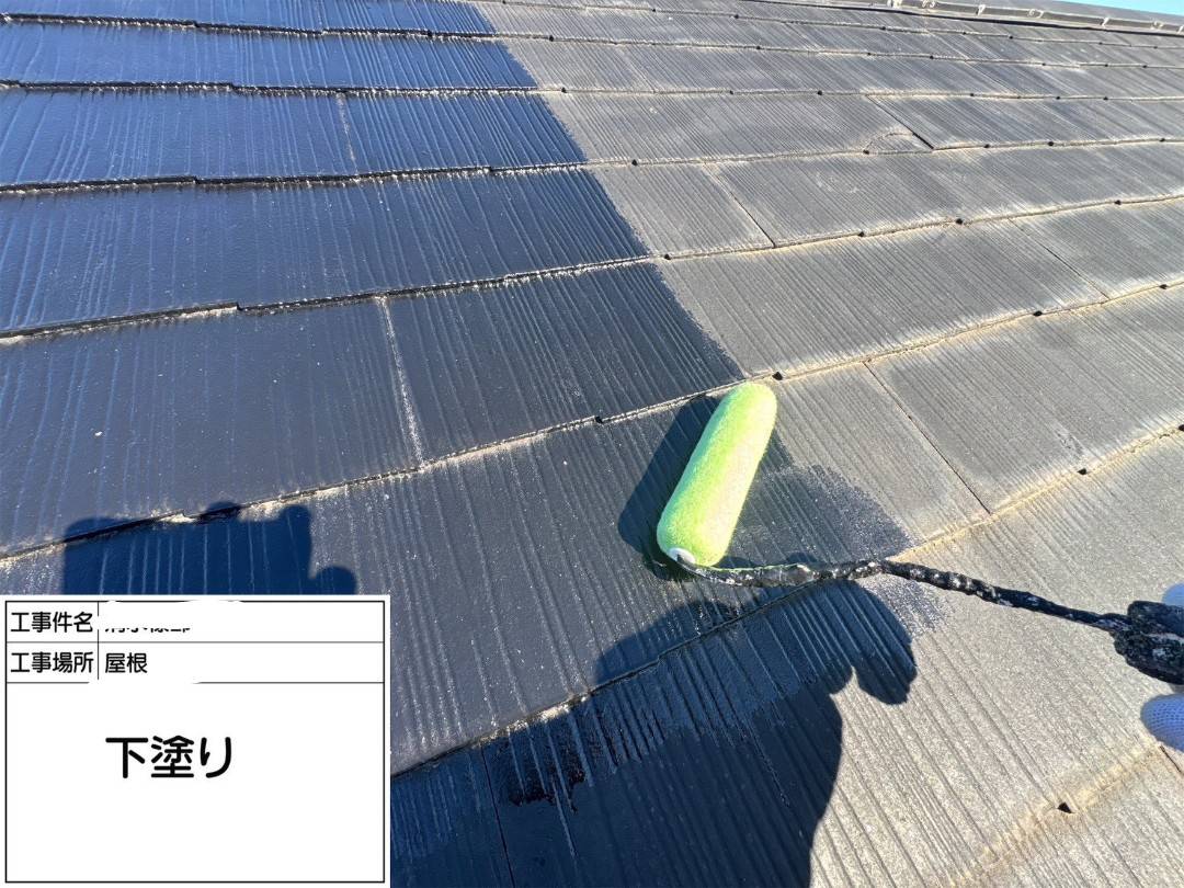 下塗りは、強化プライマーと言う材料で、劣化した屋根の強化とこれから塗装する塗膜をしっかりと受け止める接着の役目をします。