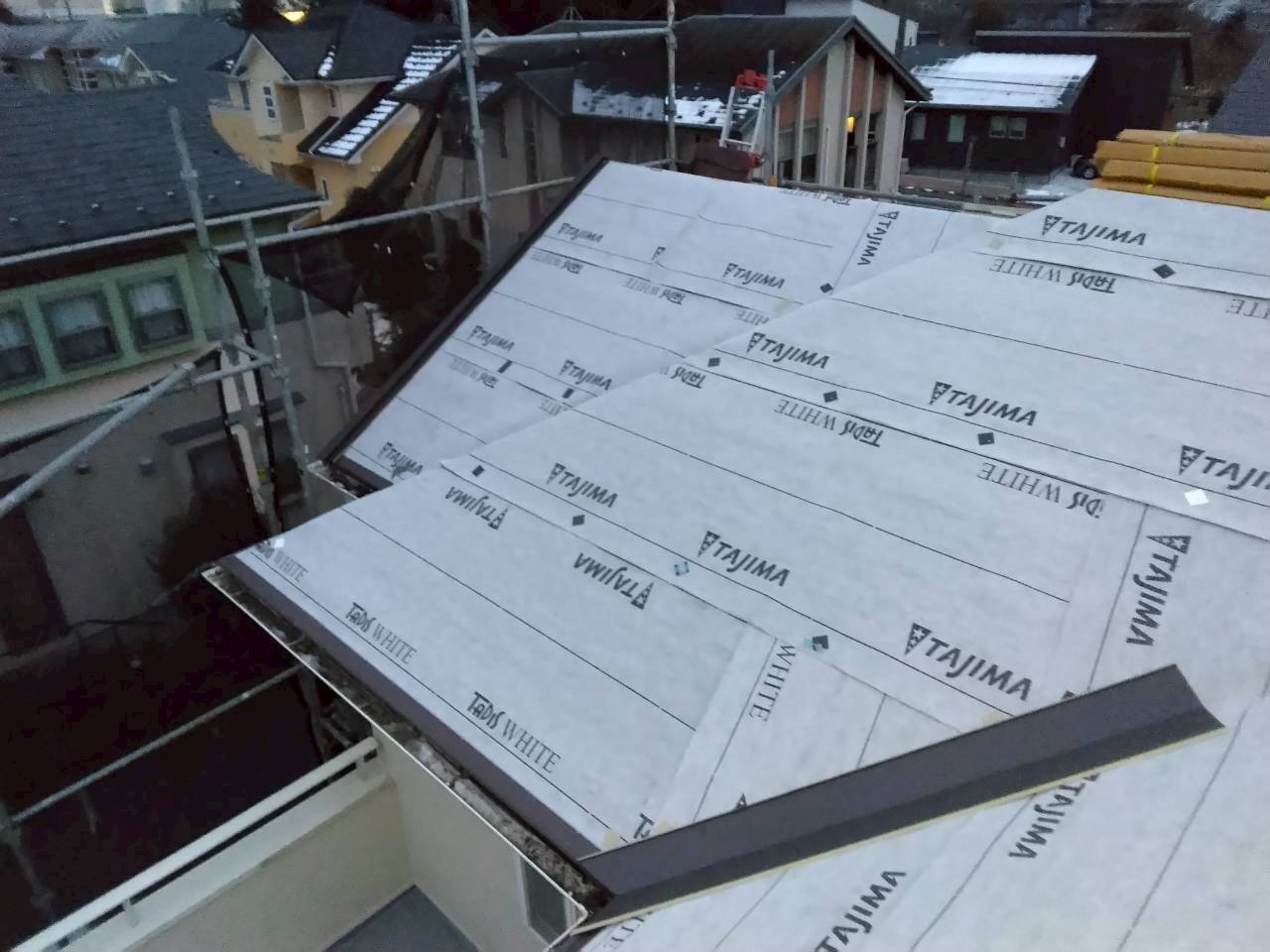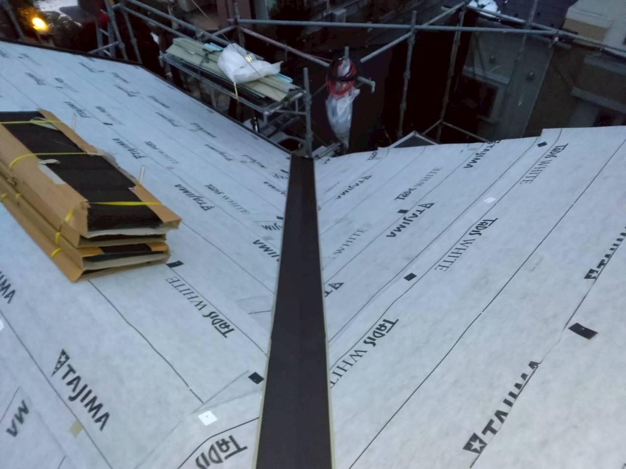 最初の工程で、既存の屋根の上にゴムアスファルトのルーフィングを敷き込む工事を行いました。