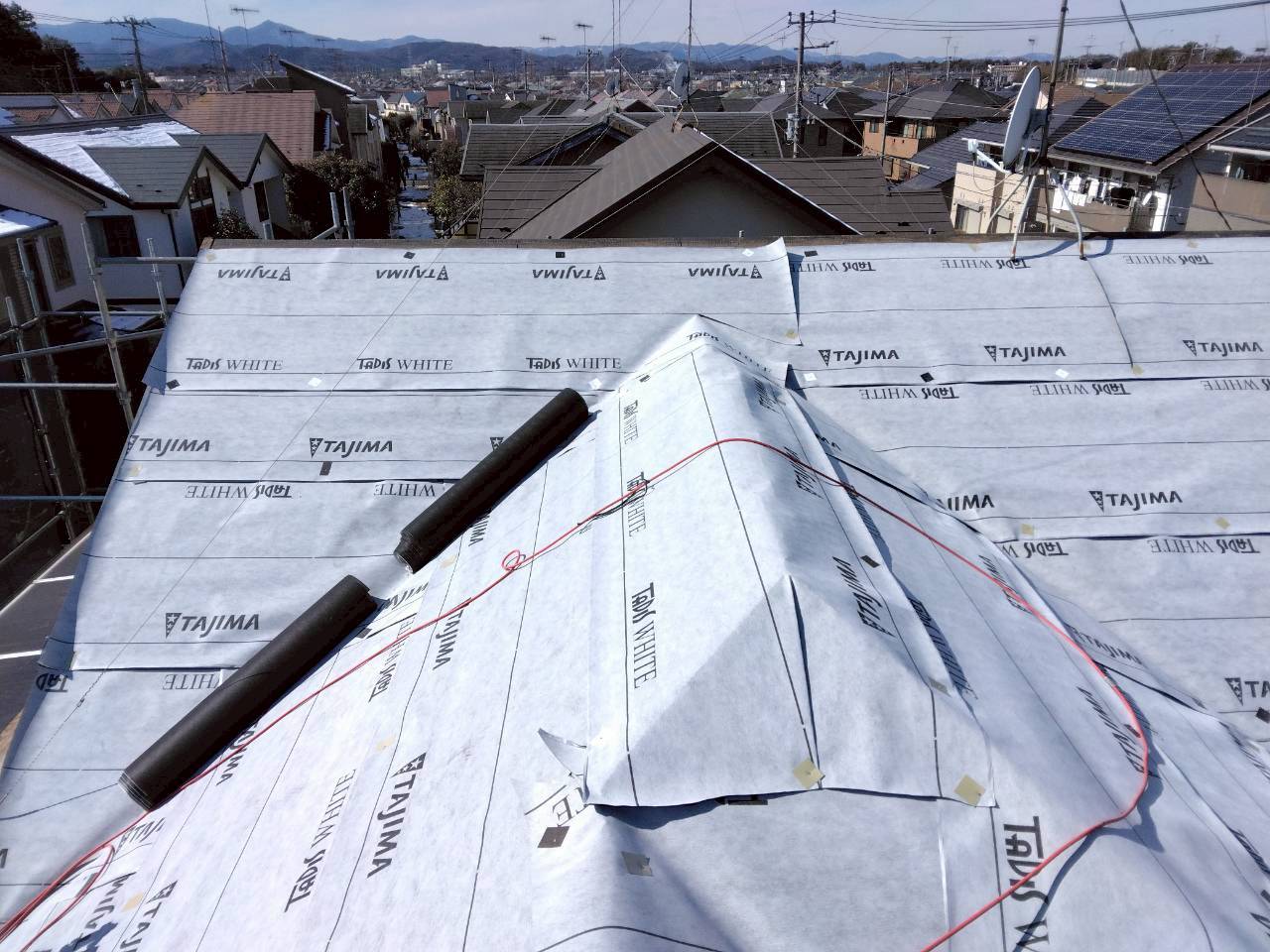 埼玉県比企郡滑川町。 屋根スカイメタルルーフ工事。 ルーフィング敷き込み工事。